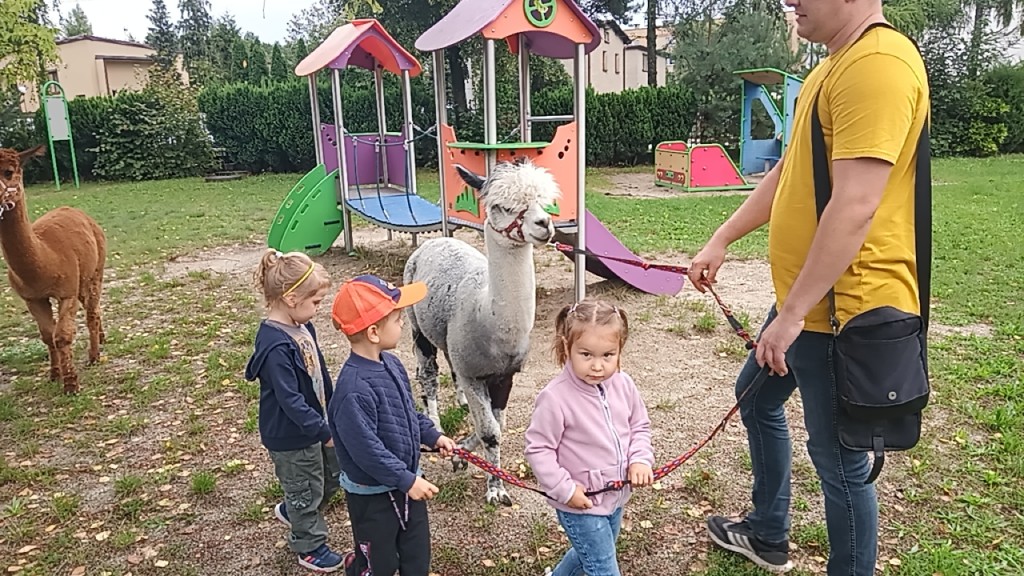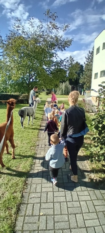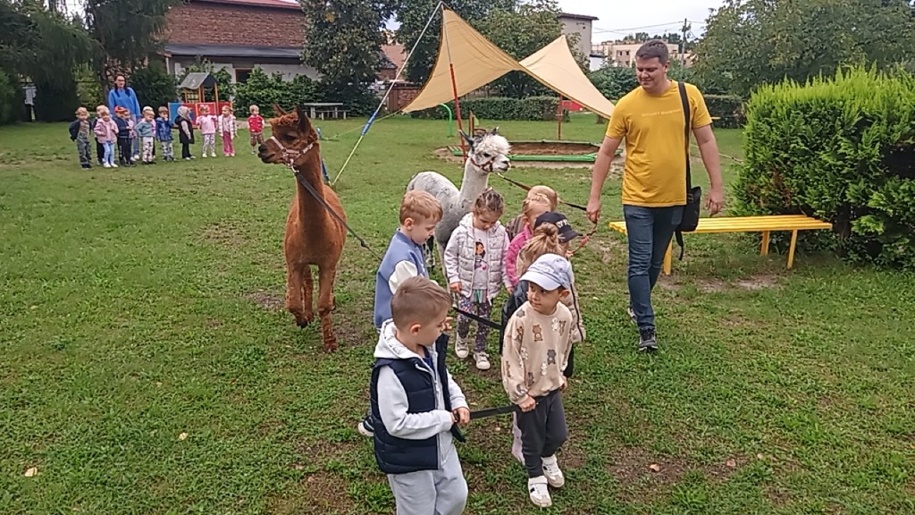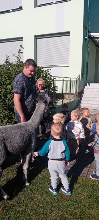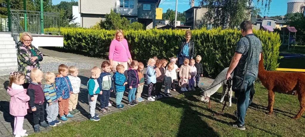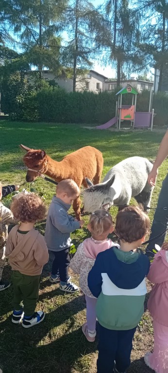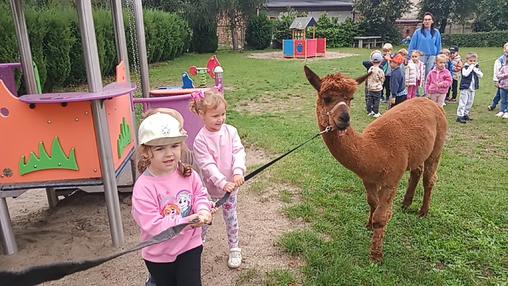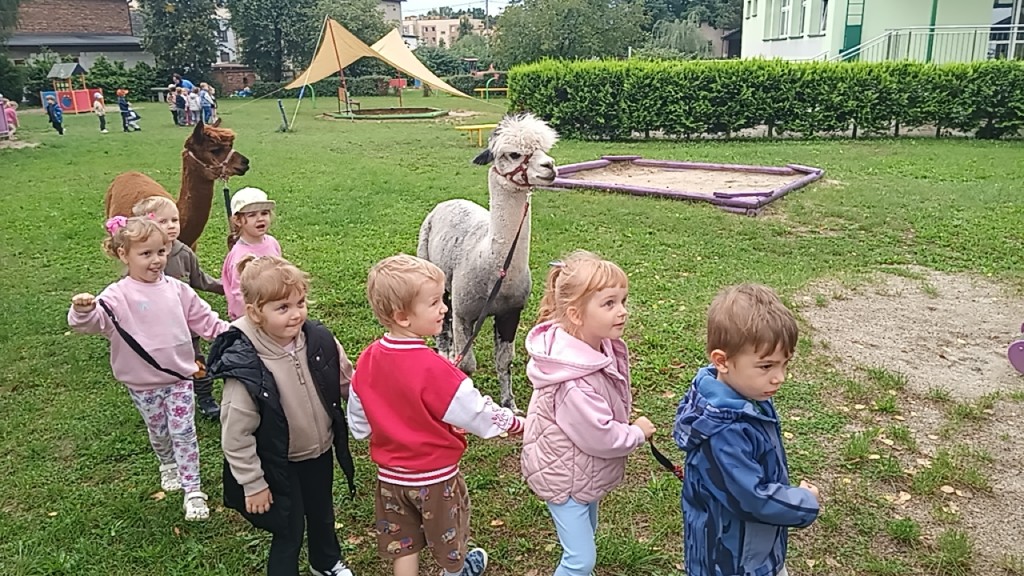 W dniach 16 i 18 września nasze przedszkole odwiedziły wyjątkowi goście – alpaki Zefir i Kopytko! Spotkanie było zorganizowane specjalnie dla pięciu najmłodszych grup przedszkolnych, które z ogromnym zaciekawieniem i radością uczestniczyły w tym niezwykłym wydarzeniu.