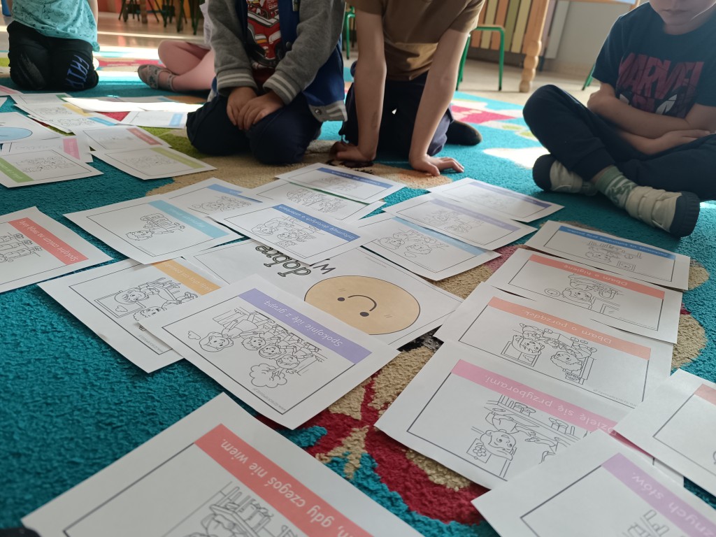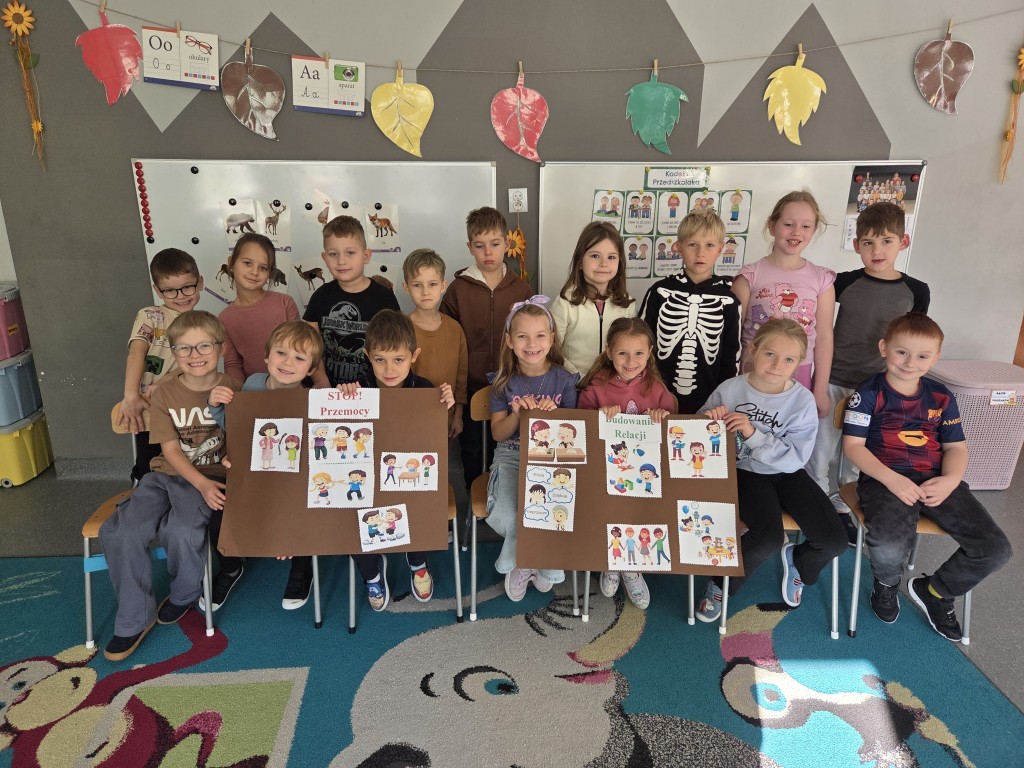 Wiedząc, jak ważny jest temat przemocy oraz budowania relacji w życiu przedszkolaków - dzieci z wszystkich grup brały udział w różnorodnych zajęciach i zabawach pozwalających na rozwijanie kompetencji społeczno-emocjonalnych. Codziennie przypominały sobie Kodeks Przedszkolaka, oparty na obowiązujących w naszym przedszkolu Standardach Ochrony Małoletnich. Zapoznawały się z materiałami przygotowanymi przez MEN. Uczyły się rozpoznawać emocje i stawiać granice.