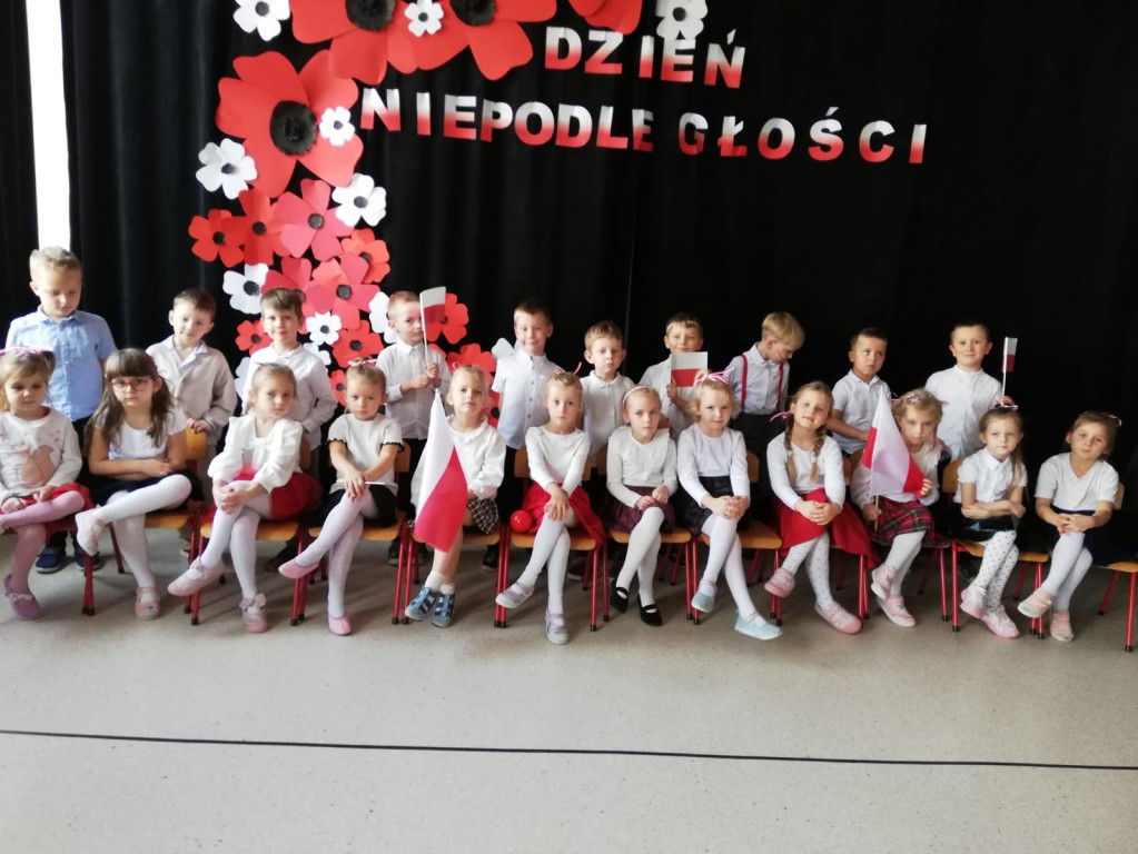 W tym wyjątkowym dniu wszystkie przedszkolaki wraz z nauczycielami uroczyście zaśpiewały hymn narodowy. Dzieci zadbały o odświętny strój i właściwą postawę podczas śpiewu.