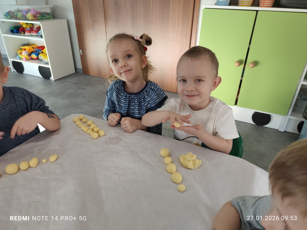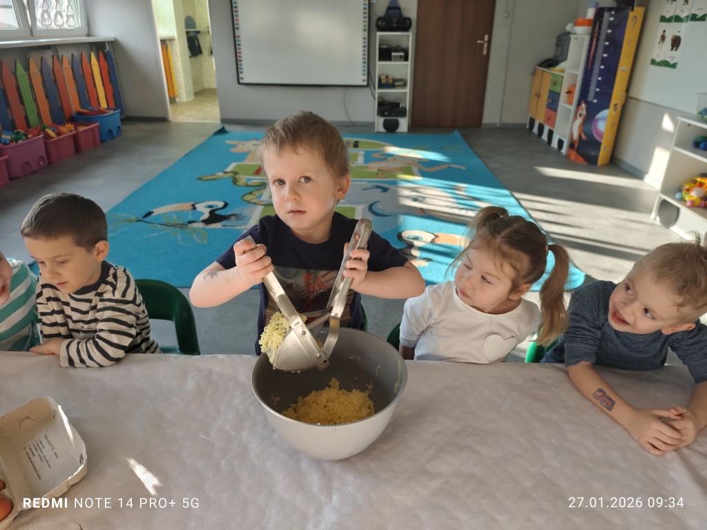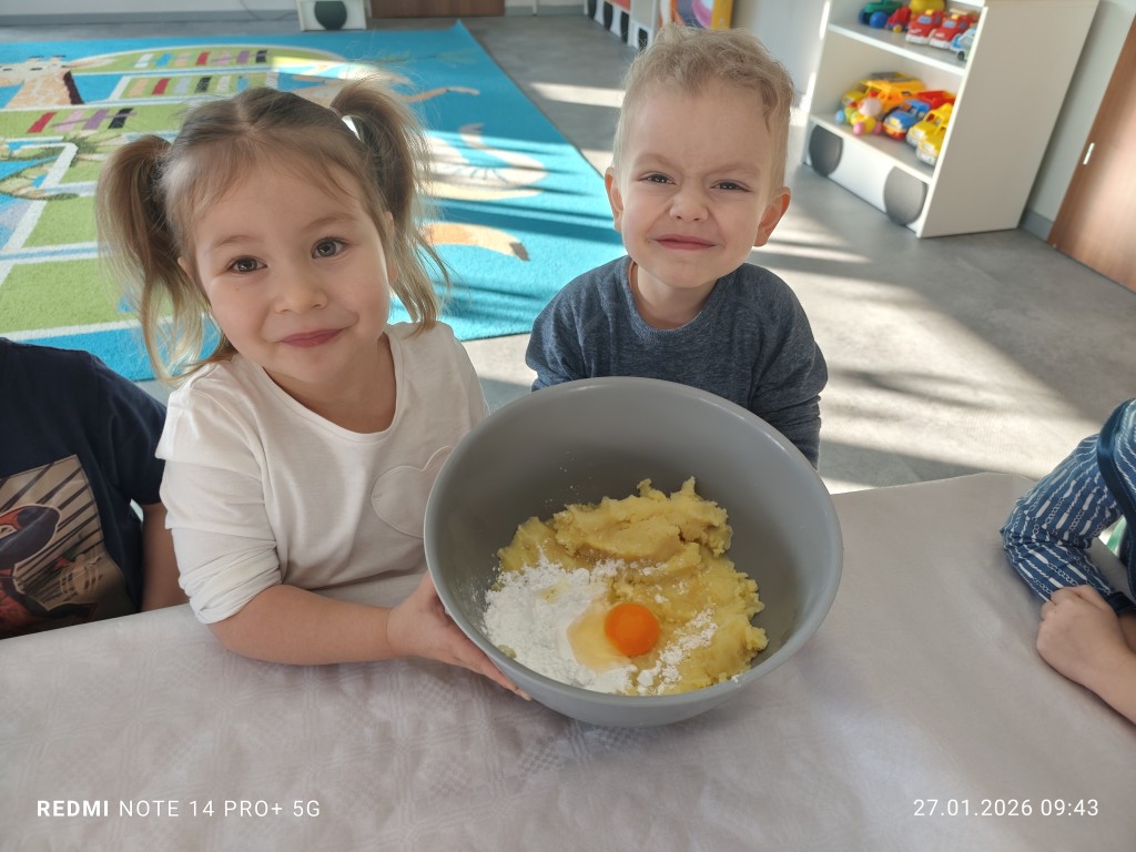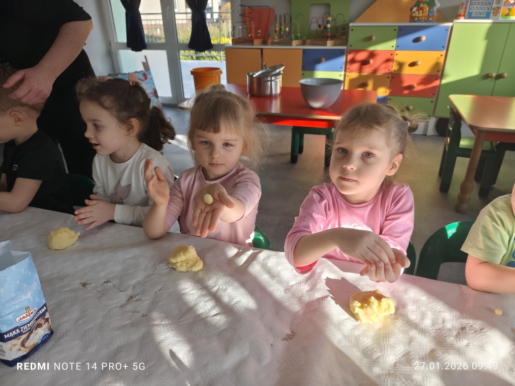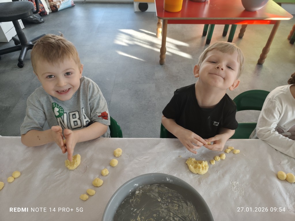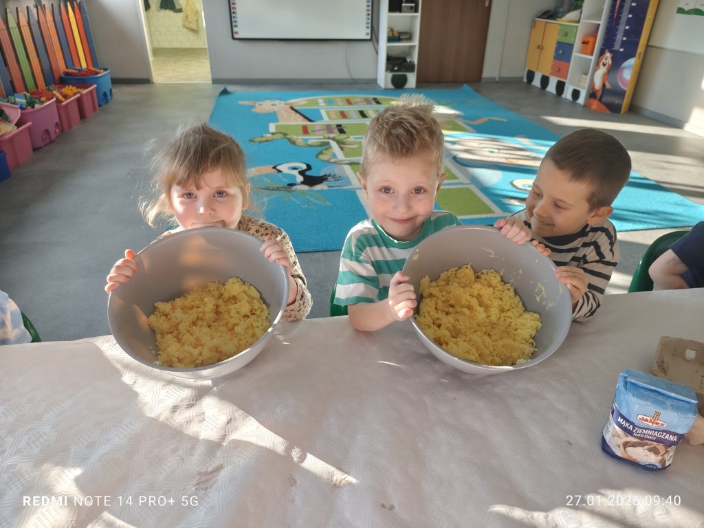 27 stycznia, sala Młodszaków, zamieniła się w kuchnię a dzieci w małych kucharzy. Naszym zadaniem, było wykonanie klusek. Poznaliśmy etapy ich przygotowania a efekty naszej pracy można zobaczyć na zdjęciach.