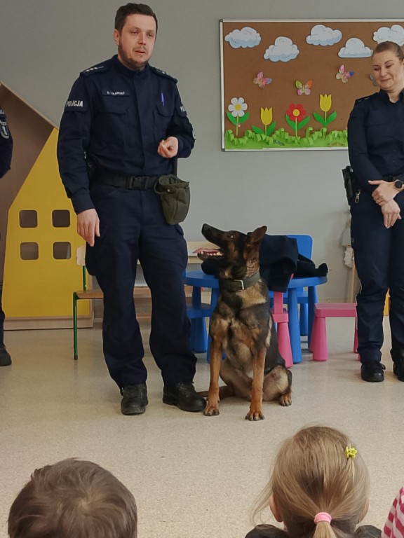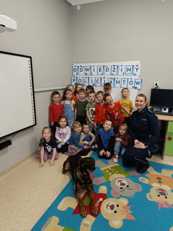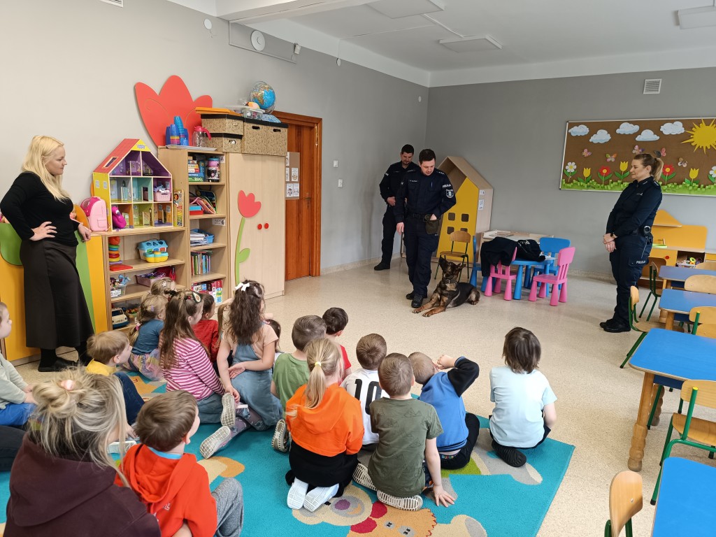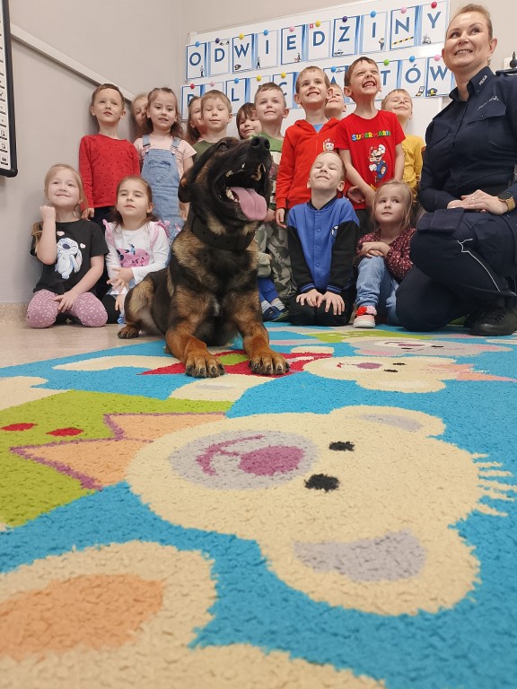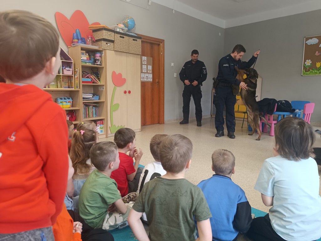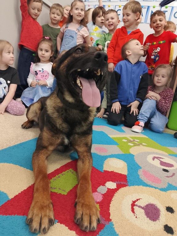 17 marca w grupie Starszaki I odbyło się wyjątkowe spotkanie z policjantami z Komendy Miejskiej w Rybniku. Dzieci poznały wiele ciekawostek na temat pracy policjanta, przypomniały sobie zasady bezpiecznego przechodzenia przez jezdnię oraz zasady bezpieczeństwa w kontakcie z nieznajomymi. Ale to nie wszystko! Na dzieci czekała jeszcze jedna niespodzianka - wizyta psa policyjnego o imieniu Leo! Dzieci dowiedziały się, jak wygląda trening i praca psa na służbie oraz poznały pozycję bezpieczną na wypadek spotkania z nieprzyjaznym lub groźnym zwierzęciem. Leo zaprezentował swoje ulubione sztuczki, otrzymując za swoje zaangażowanie jego ulubione przysmaki! Na koniec dzieci pogłaskały pieska i wręczyły gościom podziękowania. To była wspaniała przygoda!