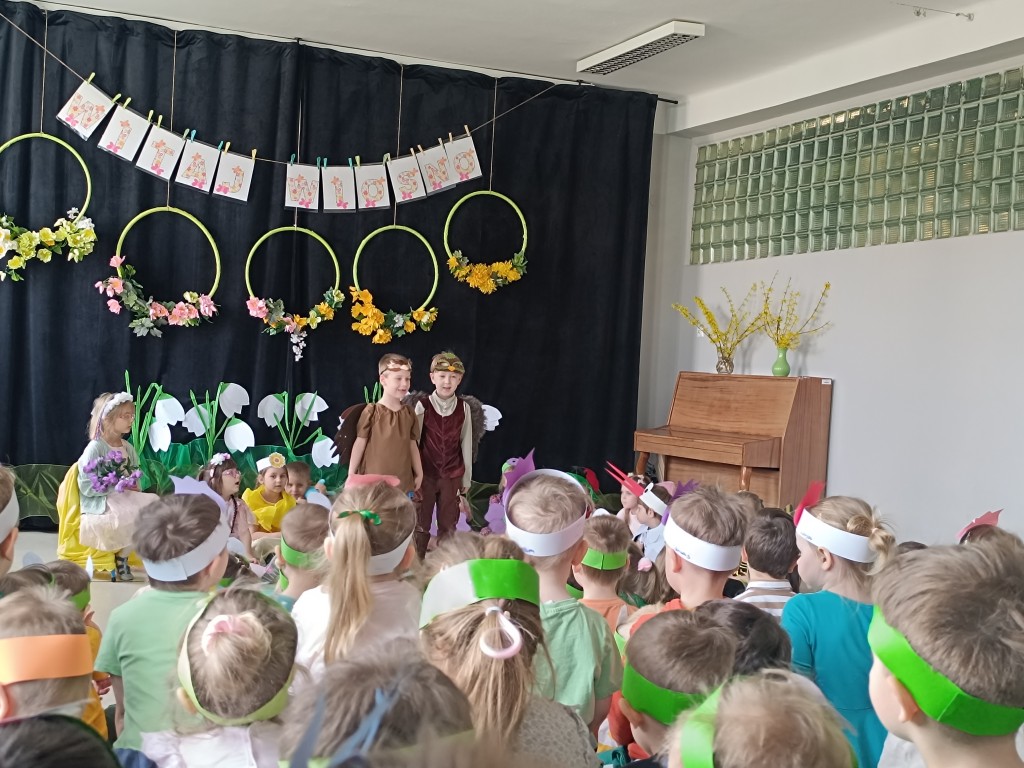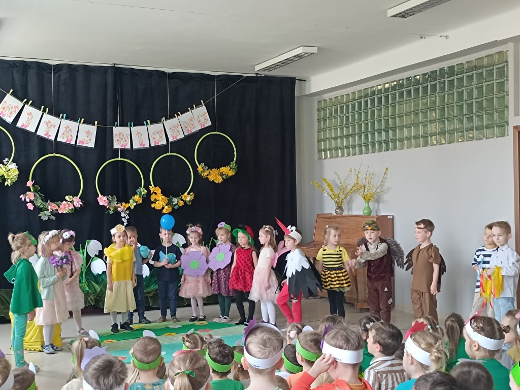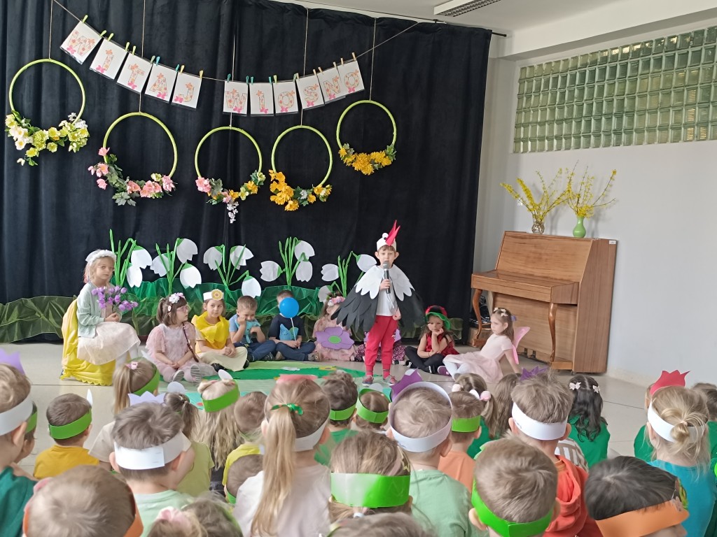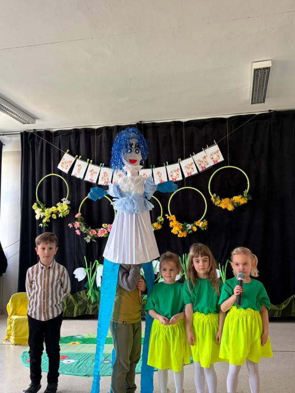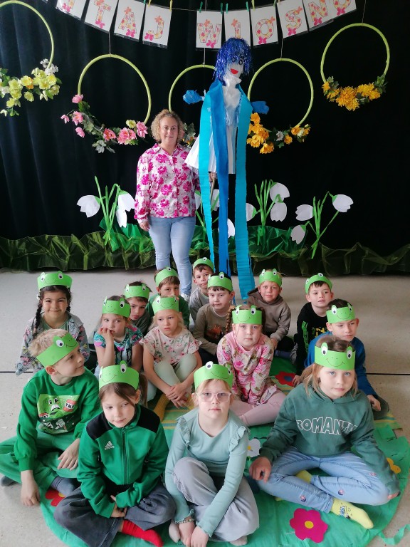 "Marzanno, Marzanno, odejdź już, prosimy. Nie chcemy już żadnych śladów zimy. Niech odejdą z Tobą mrozy oraz chłody. O powrocie zimy nie może być mowy" - tymi słowami dzieci pożegnały dziś zimę, a tańcem i piosenką powitały wiosnę. Nadchodząca pora roku przyszła z "pomocnikami" z grupy Starszaki II. Na wiosennej łące można było spotkać kwiaty, żabę, biedronkę, pszczołę, bociana, motyle, ptaki, wiatr i kroplę wody. Dzisiaj w naszym przedszkolu było wesoło i kolorowo. Cieszymy się, że jest już z nami nowa pora roku. Witaj, wiosno!