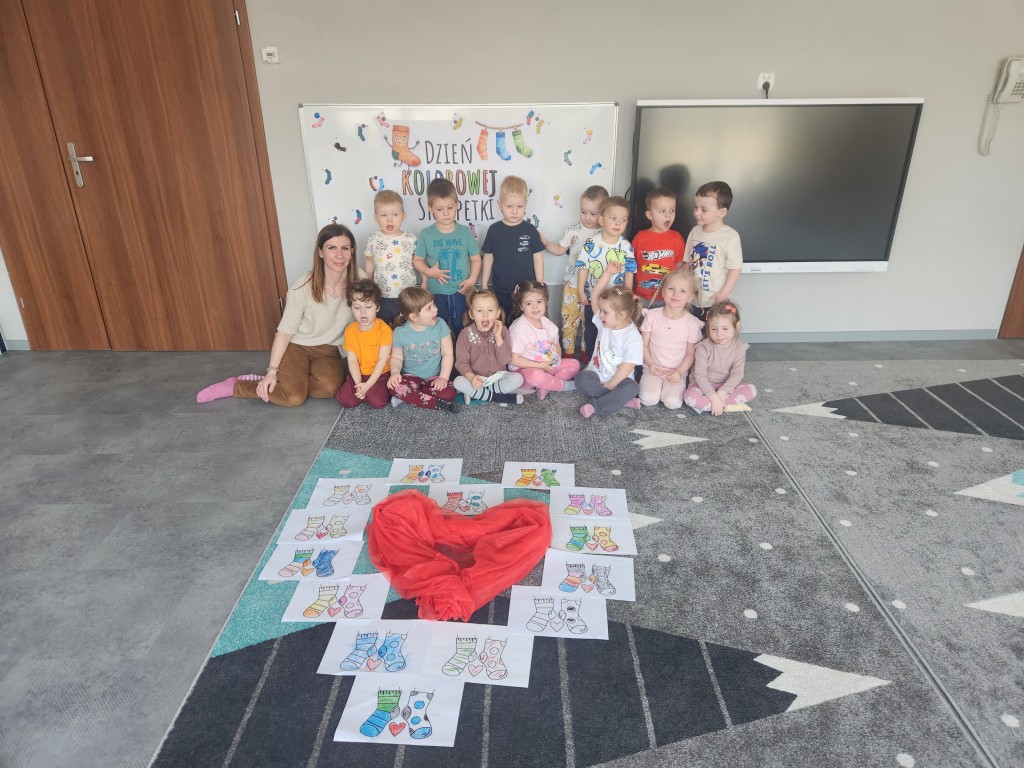 23 marca w naszym przedszkolu obchodziliśmy ,,Dzień Kolorowej Skarpetki, czyli Światowy Dzień Zespołu Downa. Tego dnia założyliśmy kolorowe, nie do pary skarpetki, aby okazać solidarność z osobami z Zespółem Downa. Dzieci poznały historię Fredzi, kolorowej skarpetki, która była inna niż wszystkie. Chętnie uczestniczyły w zabawach integracyjnych, zajęciach plastycznych i rozmowach o tym, że każdy z nas jest inny i wyjątkowy. To był dzień pełen radości i ważnych wartości!