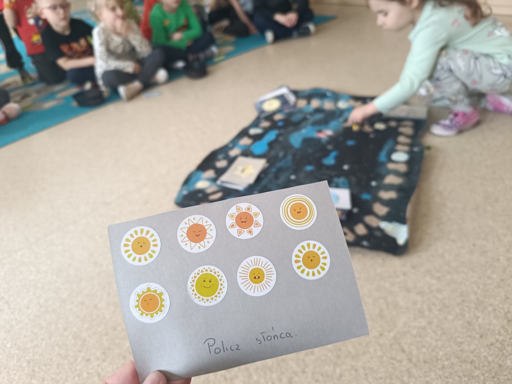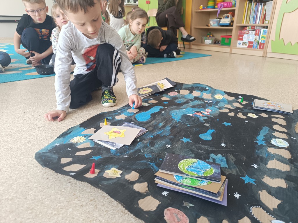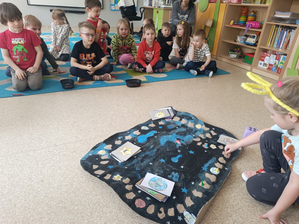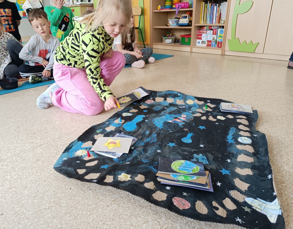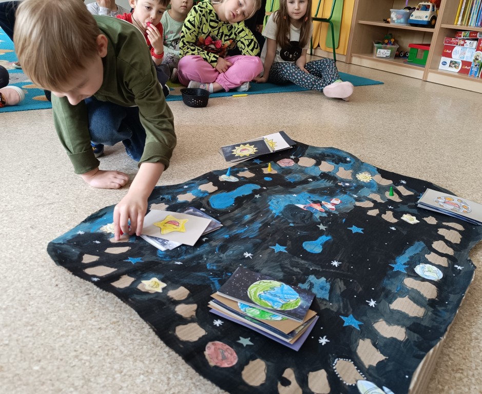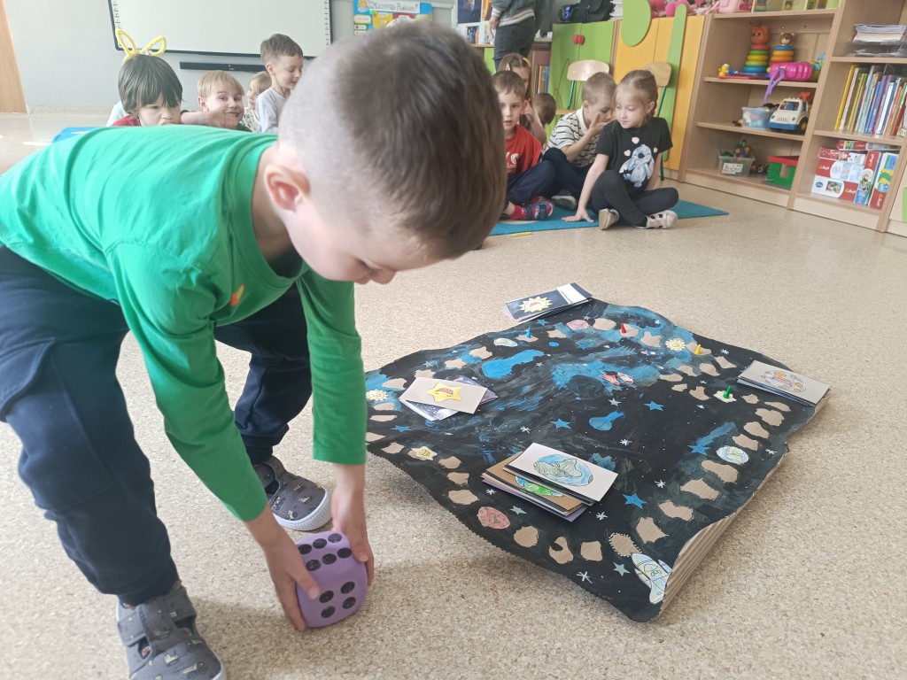 Przedszkolaki z grupy Starszaki I wyruszyły dziś w niezwykłą, kosmiczną podróż! Dzieci wzięły udział w grze planszowej o tematyce matematycznej, osadzonej w świecie planet i gwiazd. Podczas zabawy odpowiadały na pytania związane z Układem Słonecznym, pojęciami związanymi z następstwem czasu, mierzyły się z zadaniami matematycznymi oraz zagadkami słownymi.