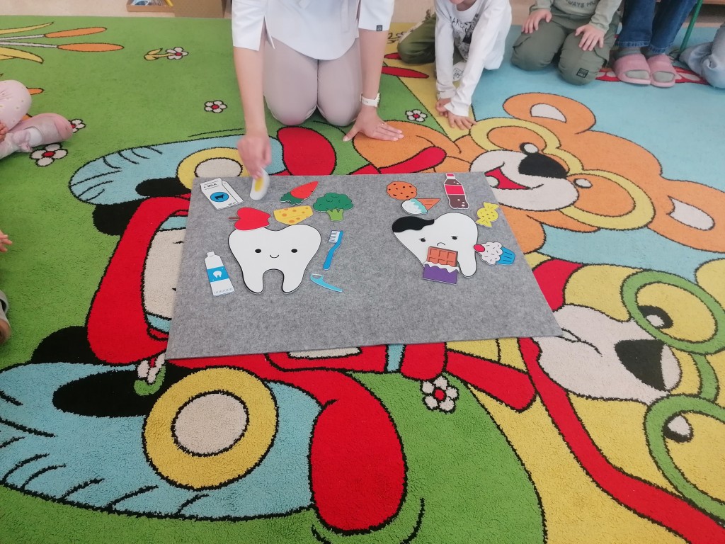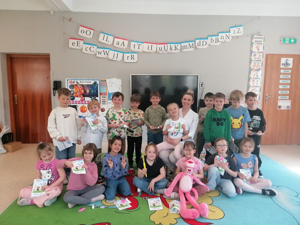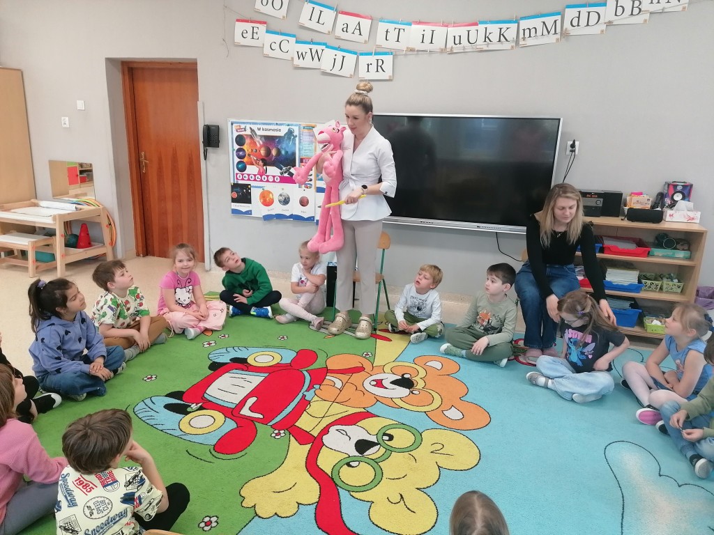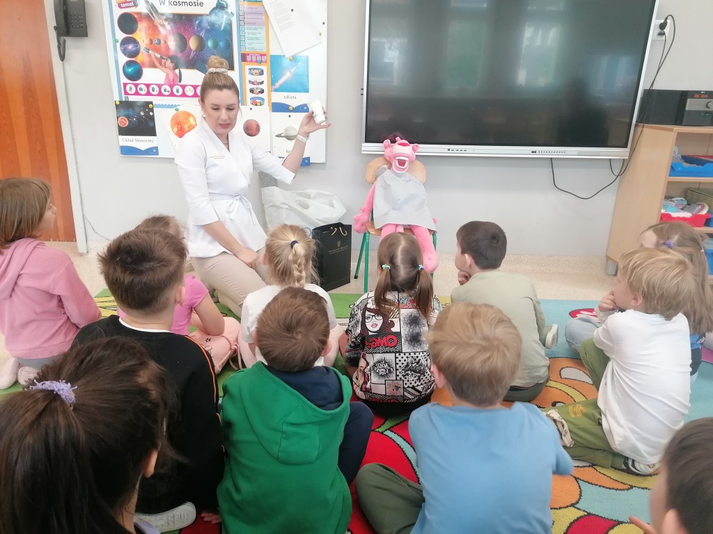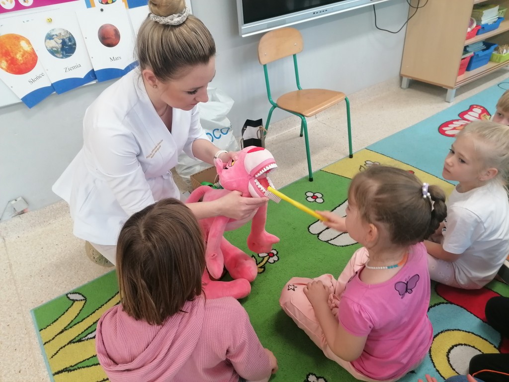 W grupie Zerówka I gościliśmy Panią stomatolog, która przeprowadziła ciekawe zajęcia edukacyjne na temat higieny jamy ustnej. Dzieci miały okazję dowiedzieć się, jak prawidłowo dbać o zęby oraz dlaczego jest to tak ważne. Największą atrakcją była „Różowa Pantera”, na której Pani stomatolog pokazywała, jak poprawnie myć zęby a dzieci zapoznały się z zawodem stomatologa. Spotkanie przebiegło w miłej i radosnej atmosferze, a przedszkolaki z dużym zainteresowaniem uczestniczyły w zajęciach.