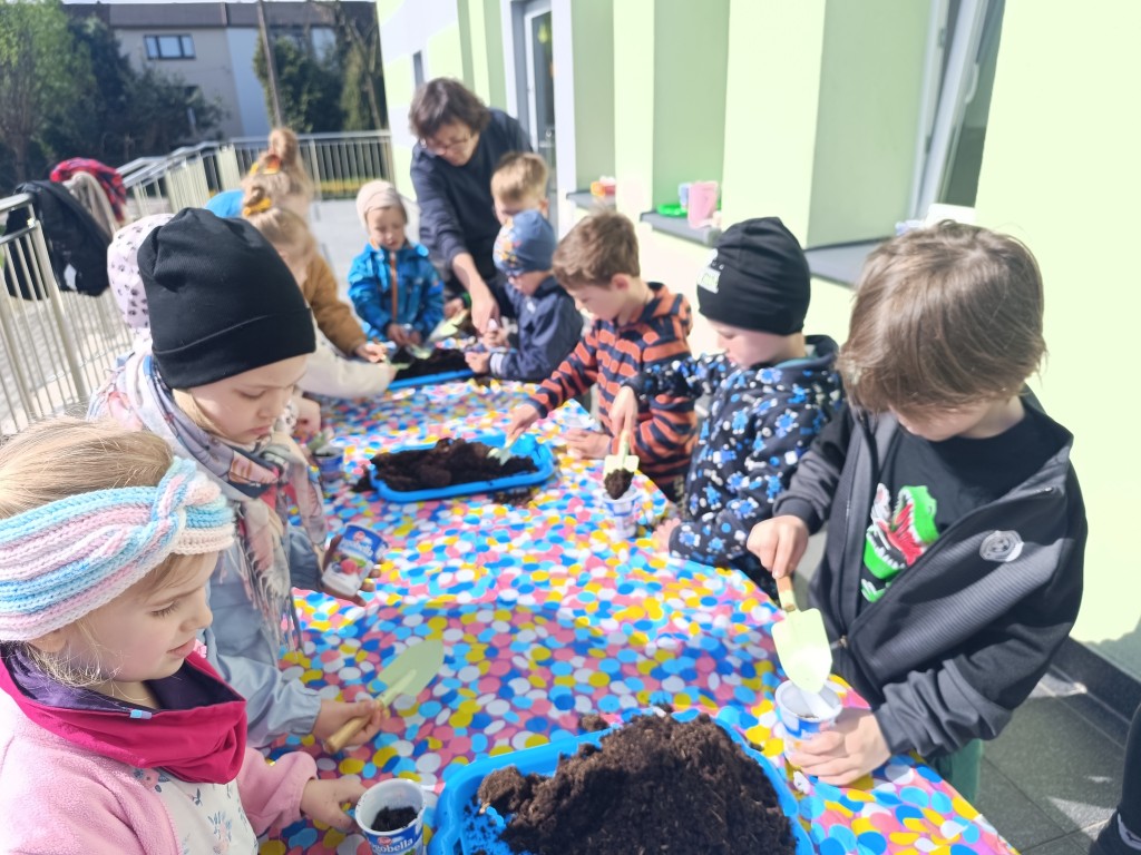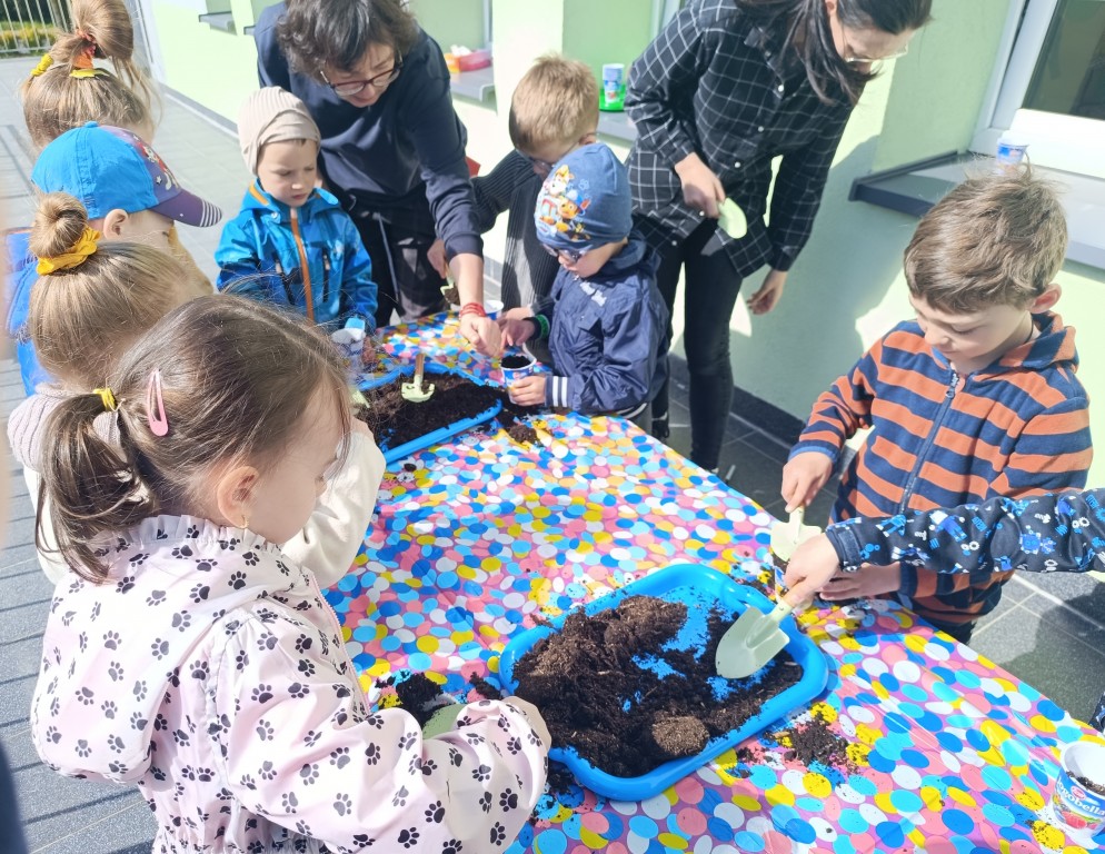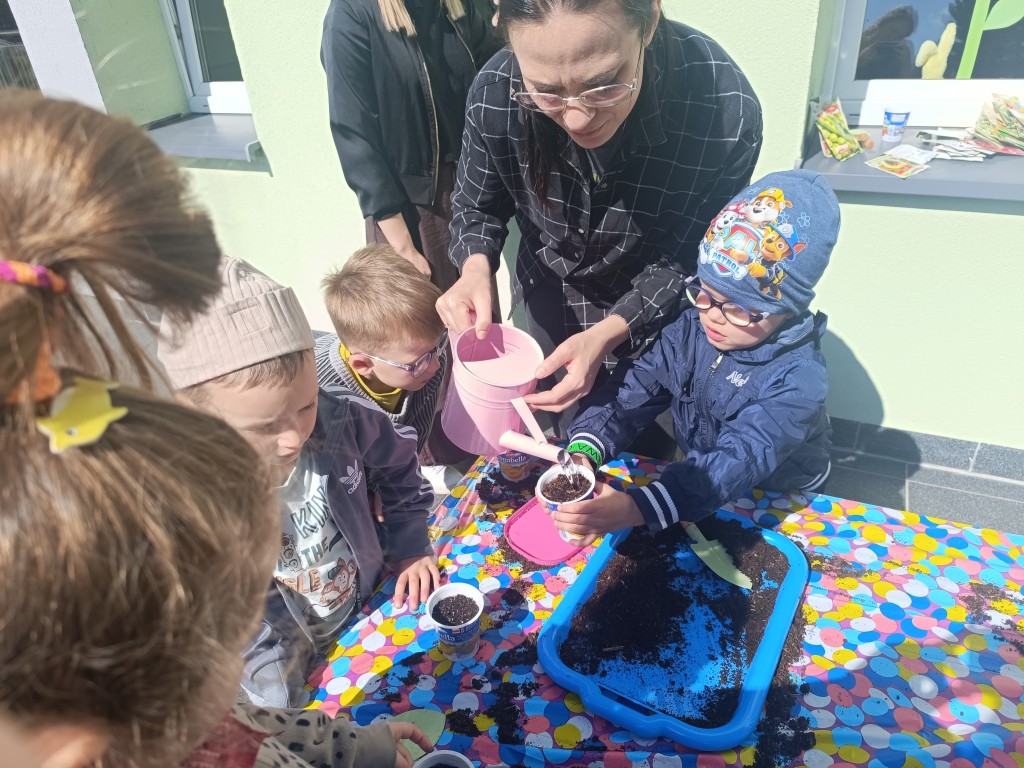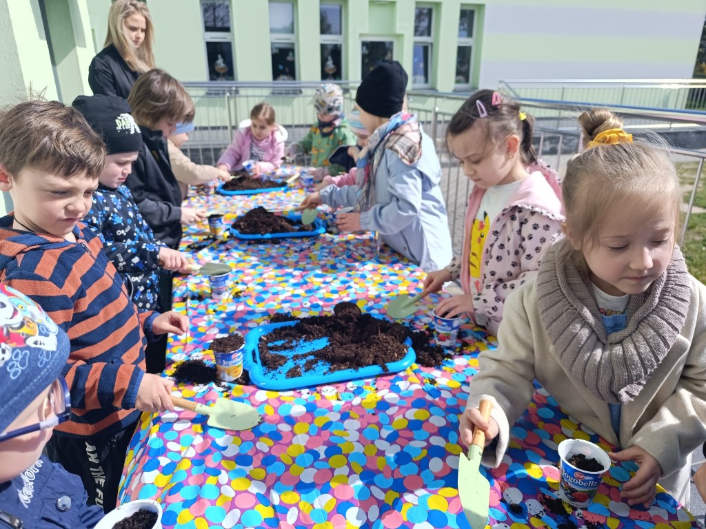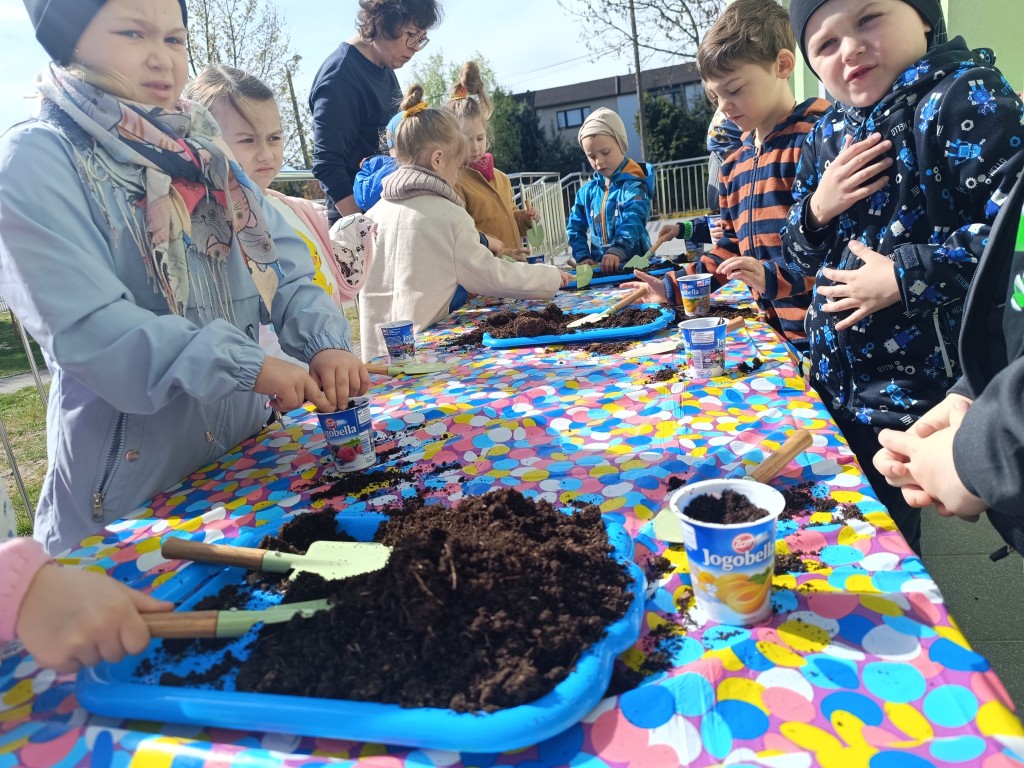 Dzieci wysłuchały ciekawego opowiadania o recyklingu, porozmawiały o tym, jak możemy dbać o planetę, a na końcu - wysiały nasionka różnych roślin, wykorzystując do tego opakowania po jogurtach w duchu zero waste. Przygotowały także sadzonki, które już niebawem staną się kolorową ozdobą biblioteki. Na koniec dzieci zaprosiły Panią Beatę do przedszkolnego ogródka, by pochwalić się rosnącymi roślinami.