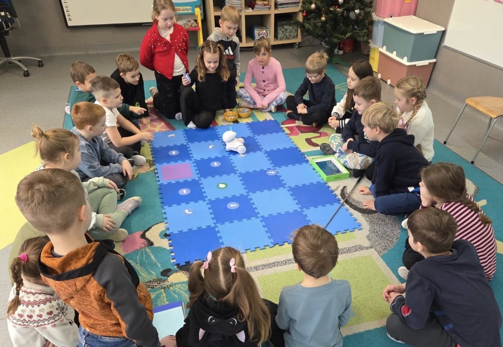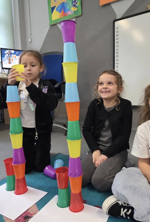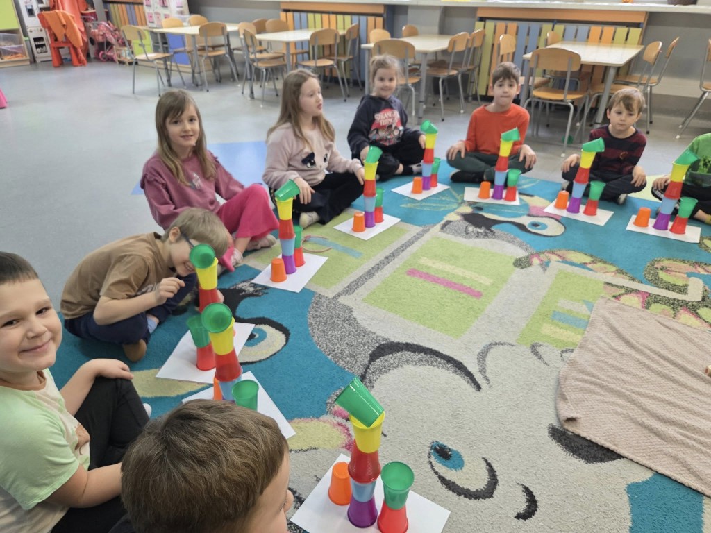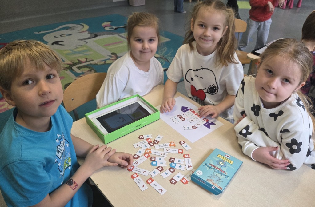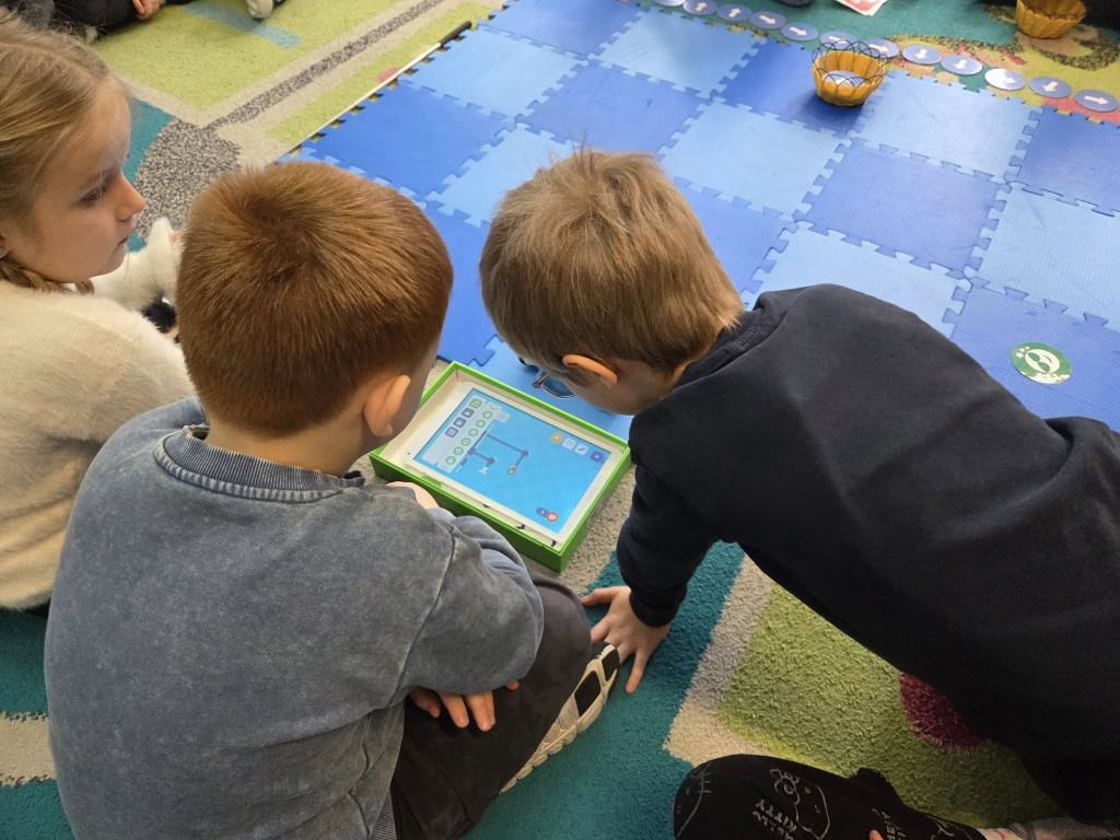 W naszym przedszkolu realizujemy międzynarodowy program „Kodowanie na dywanie”, który wprowadza dzieci w świat logicznego myślenia i podstaw programowania w sposób dostosowany do ich wieku i możliwości. Zajęcia odbywają się w formie zabawy z wykorzystaniem mat, kart obrazkowych, kolorowych symboli, robota edukacyjnego Photon, kolorowych kubków oraz Ozobotów. Program rozwija u dzieci umiejętność analizowania, planowania i rozwiązywania problemów, a także wspiera koncentrację, pamięć i współpracę w grupie. Dzięki „Kodowaniu na dywanie” przedszkolaki uczą się, że błędy są naturalną częścią nauki, a dochodzenie do celu może być fascynującą przygodą. Udział w programie kształtuje również kompetencje przyszłości, takie jak kreatywność, samodzielność i myślenie przyczynowo-skutkowe, jednocześnie wzmacniając pewność siebie dzieci. Nauka przez zabawę sprawia, że dzieci z radością podejmują nowe wyzwania i aktywnie uczestniczą w zajęciach.